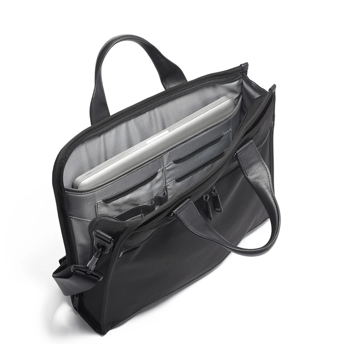 Op zoek naar een nieuwe aktetas? Misschien voldoet deze tas uit de Alpha serie van Tumi wel helemaal aan jouw wensen. Ideaal voor werk, maar ook uitstekend te gebruiken als tas voor dagelijks gebruik, waar je ook je laptop op een veilige manier in mee kunt nemen. De aktetas is gemaakt van nylon en heeft een effen patroon. Deze Tumi tas is voorzien van een geïntegreerd laptopvak, geschikt voor een laptop van maximaal . Wil je 100% zeker weten dat je laptop ook echt past? Meet dan de buitenafmeting van je laptop even op. Deze dient kleiner te zijn dan de buitenafmetingen van deze tas (de buitenafmetingen van deze aktetas zijn H 32 x B 7.5 x D 41.5). Op deze tas wordt 5 jaar garantie gegeven.